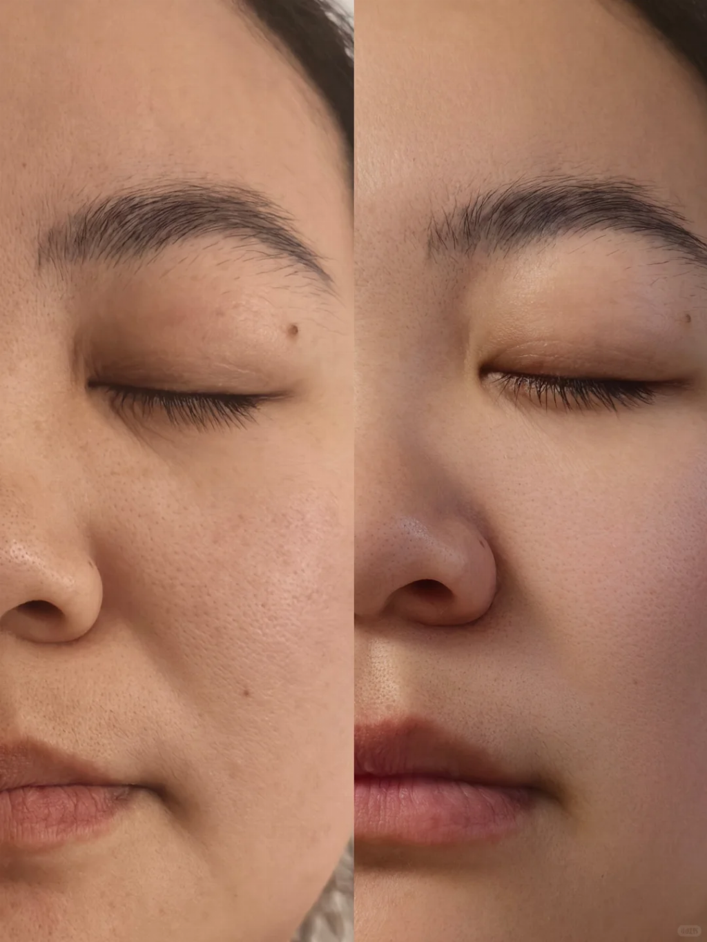 第 8-18 天淺層曬斑、痘印開(kāi)始淡化。全臉膚色均勻度提升,鼻翼、嘴角等暗沉區(qū)域變亮。面部臟感、疲憊感減少,氣色肉眼可見(jiàn)變好。