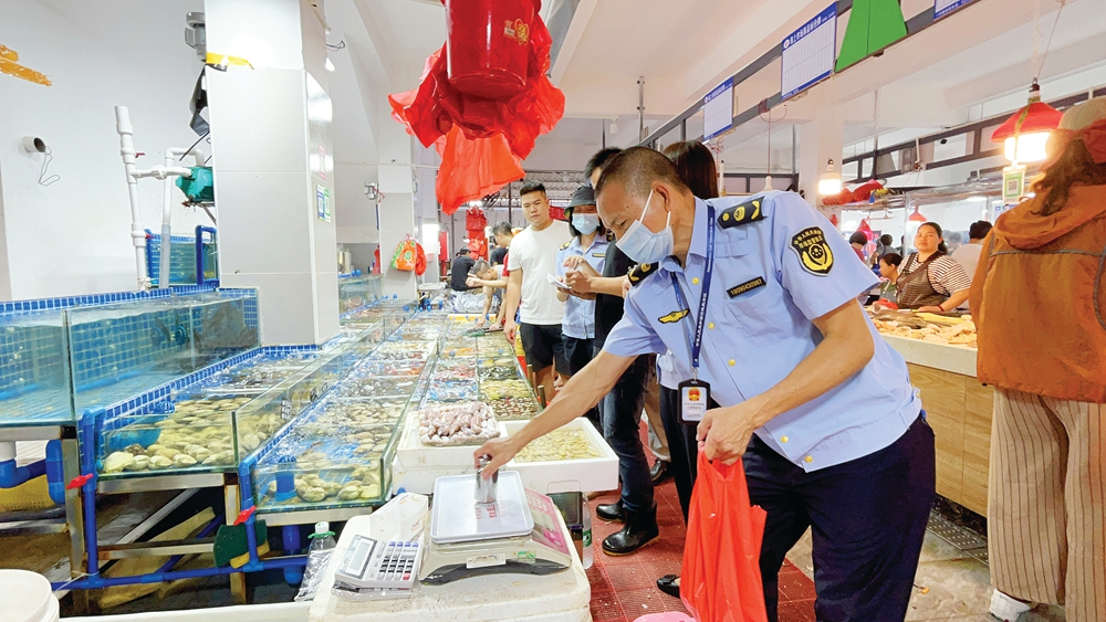 執(zhí)法人員在惠東港口濱海旅游度假區(qū)的海鮮市場開展“清秤大行動”;葜萑請笥浾吆轾o兒 攝