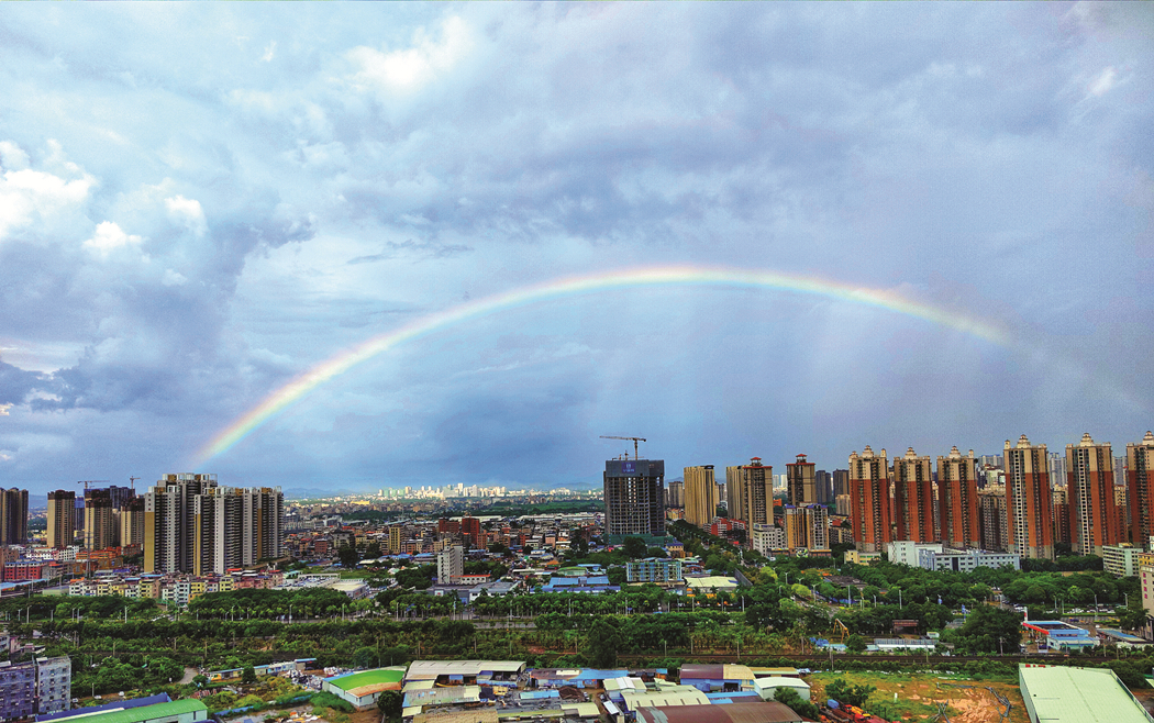 8月11日15時48分,惠州市氣象臺發(fā)布惠城區(qū)暴雨黃色預(yù)警信號。17時許,一場短暫暴雨過后,一道彩虹出現(xiàn)在市區(qū)江北天空,不少路人紛紛停下腳步記錄這一時刻,大約5分鐘后彩虹漸漸消失。