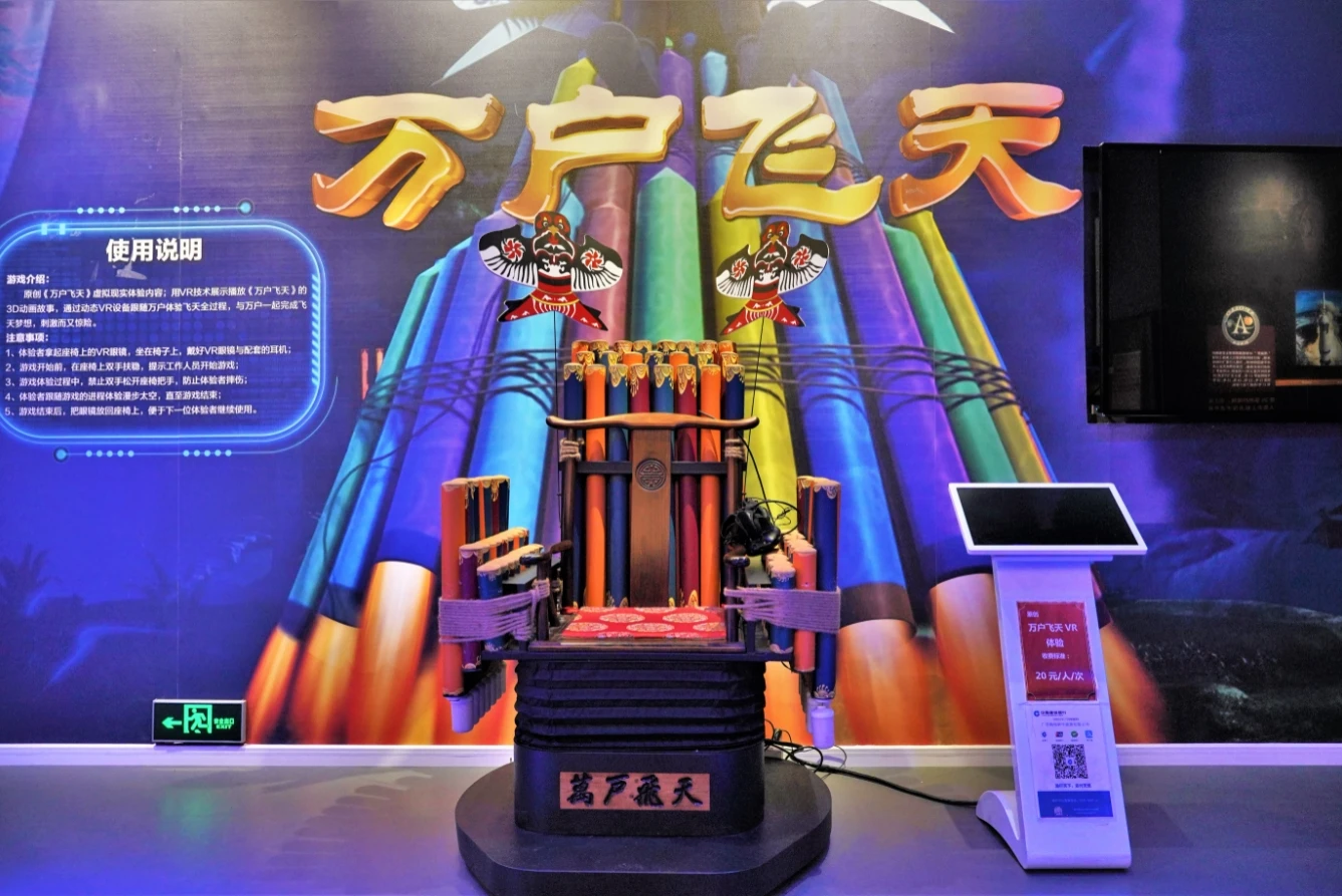 坐上座椅打開(kāi)VR開(kāi)關(guān),能模擬明朝萬(wàn)戶飛天的情景。