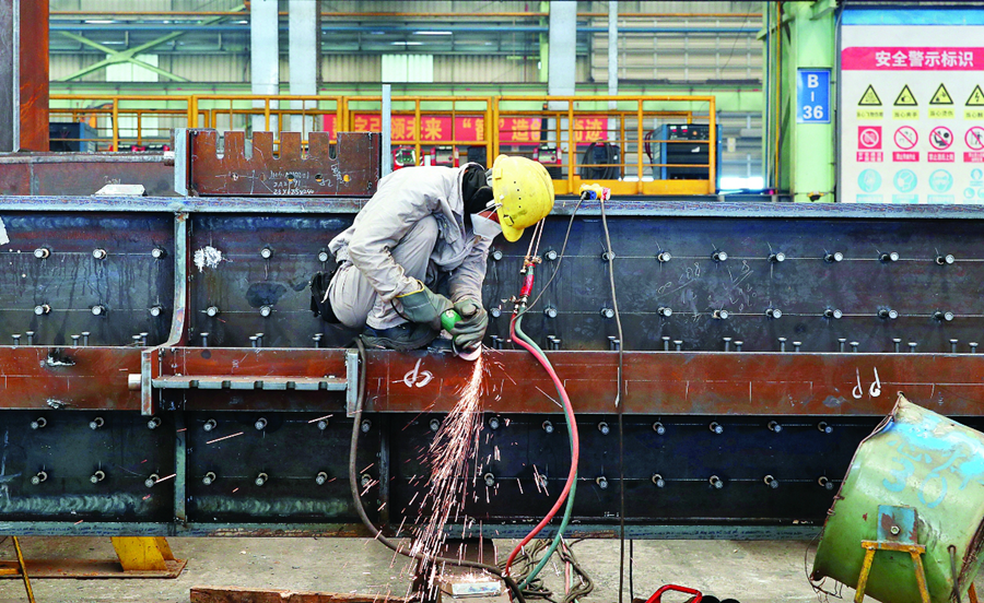 中建鋼構(gòu)廣東有限公司工人在進(jìn)行焊接作業(yè);葜萑?qǐng)?bào)記者鐘暢新 攝
