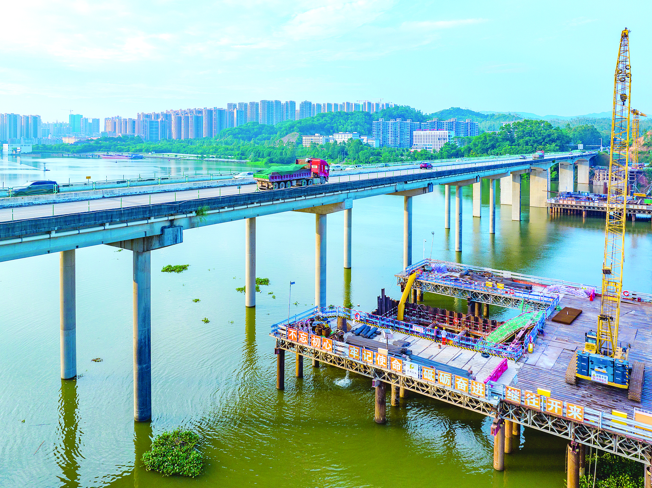 惠河高速改擴(kuò)建東江特大橋開啟水中墩身施工。 惠州日?qǐng)?bào)記者戴建 通訊員劉志浩 攝