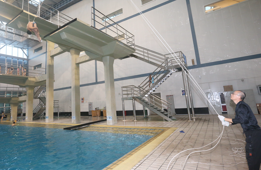 運動員在6米臺進行前空翻二圈半屈體動作訓練。
