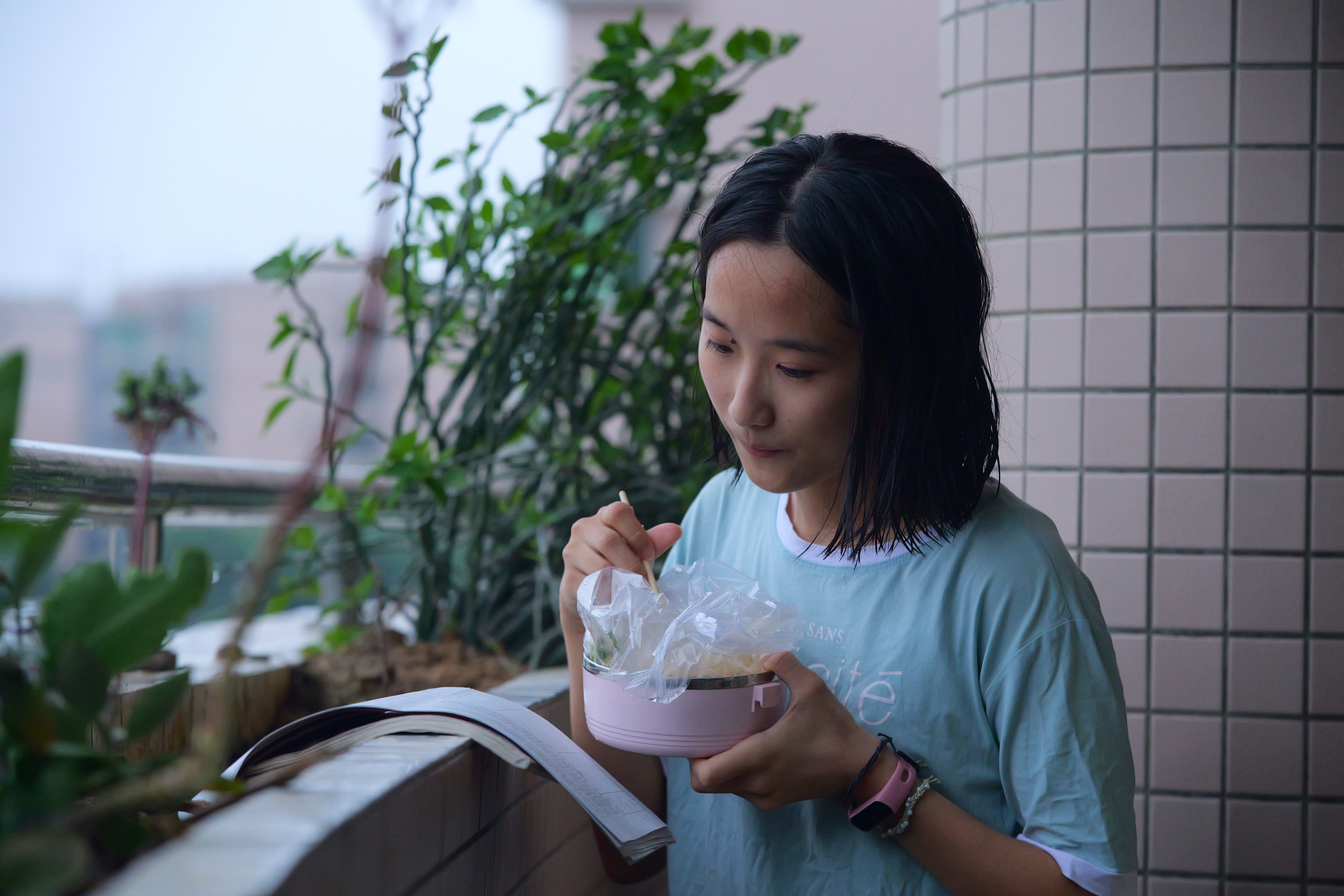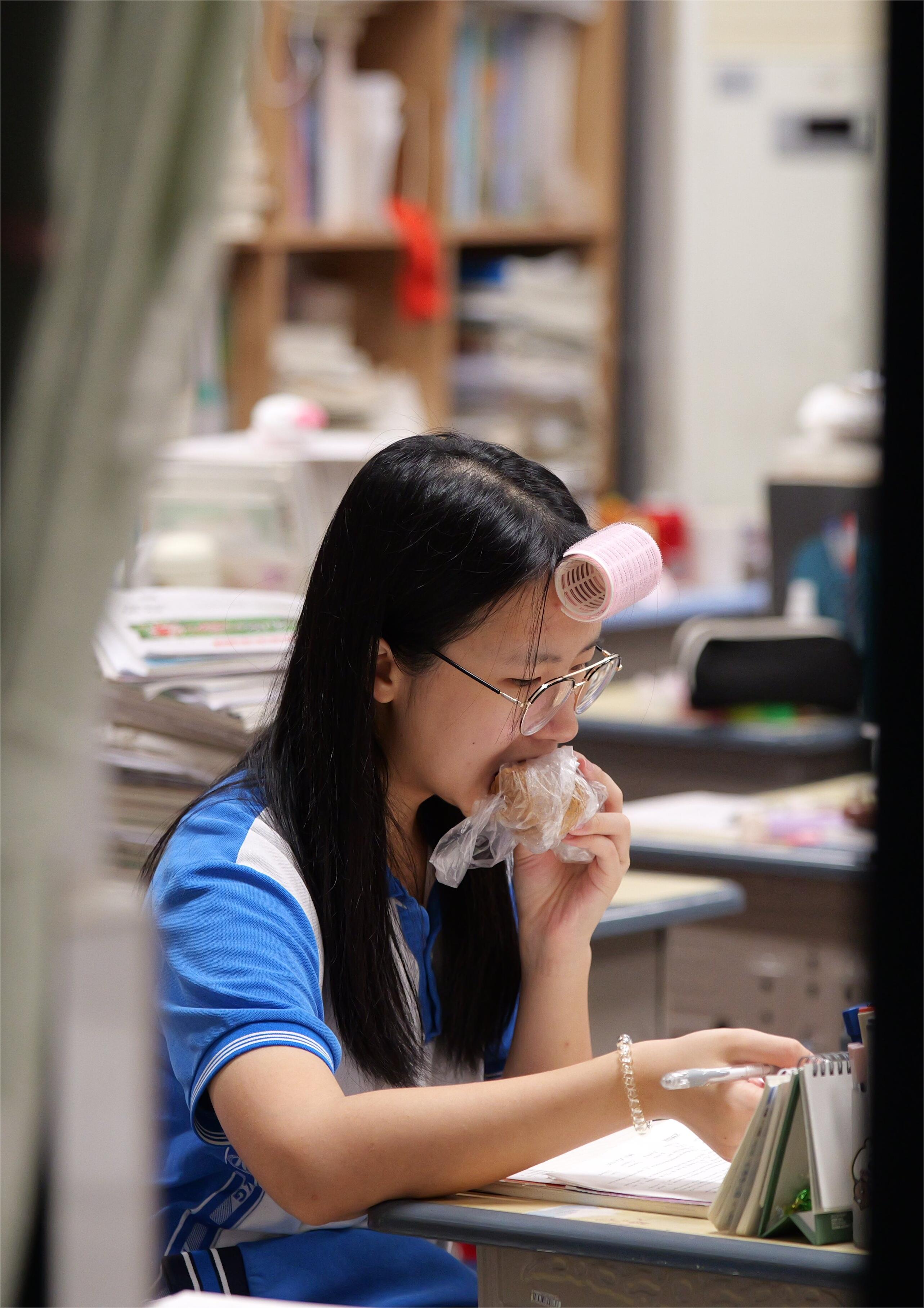 高三(19班)葉雅今告訴記者:”為了有更多的學(xué)習(xí)時(shí)間,許多同學(xué)跟我一樣,在飯?zhí)么虬埐藖碚n室邊吃邊學(xué)習(xí)。”