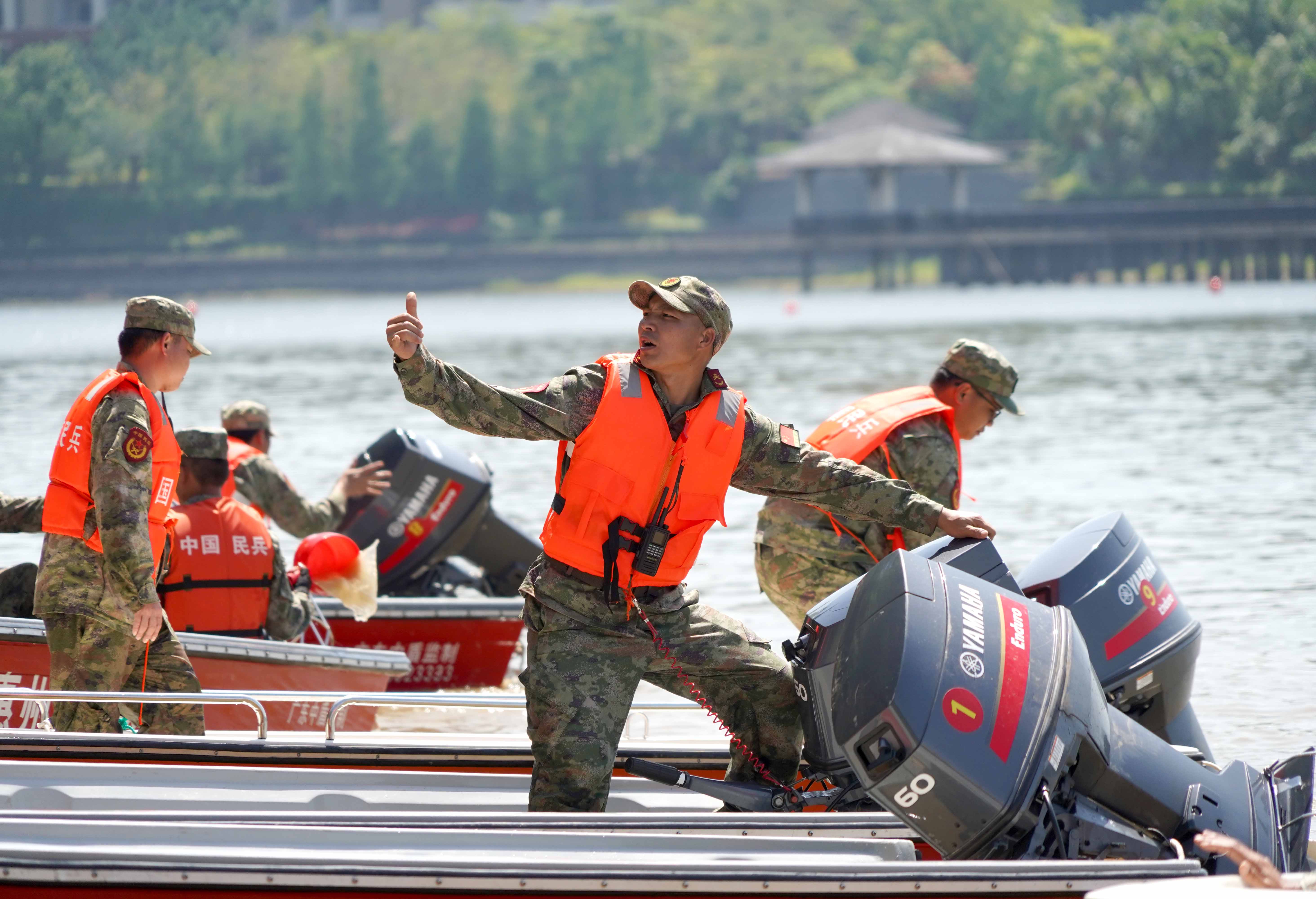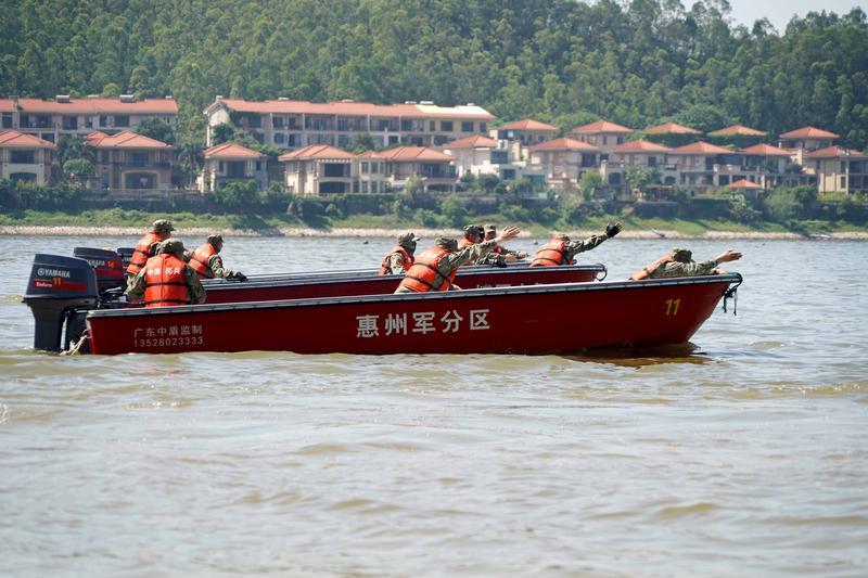 當(dāng)天上午,在惠城區(qū)角洞水庫寬闊的水面上,只見參加演練的民兵骨干軍容嚴(yán)整、士氣高昂,大家操作班組沖鋒舟先后進行了S形過障、倒舟行駛、通過障礙和協(xié)同搜救課目連貫考核。
