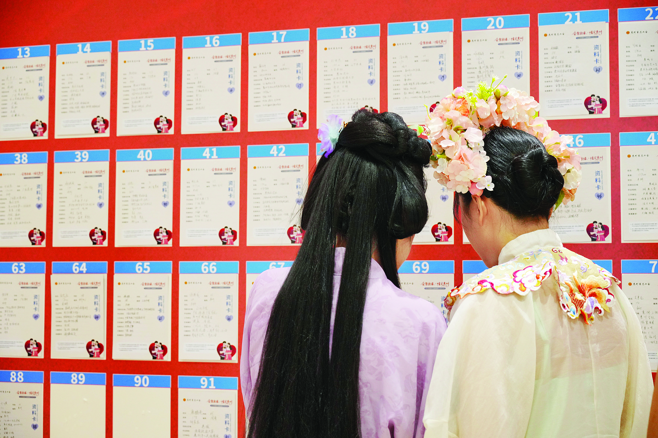 此外,現(xiàn)場還特別設置了漢服體驗角,整齊陳列著素雅襦裙、大氣曲裾、靈動褙子等各式漢服,以及發(fā)簪、步搖、團扇、折扇等精致配飾。專業(yè)造型師還會根據(jù)嘉賓喜好幫他們梳好發(fā)髻、調(diào)整妝容。不少男女嘉賓駐足體驗,沉浸式感受傳統(tǒng)服飾之美,傳統(tǒng)文化的雅致與青年間的鮮活互動交織,讓初識的氛圍更顯溫馨浪漫。