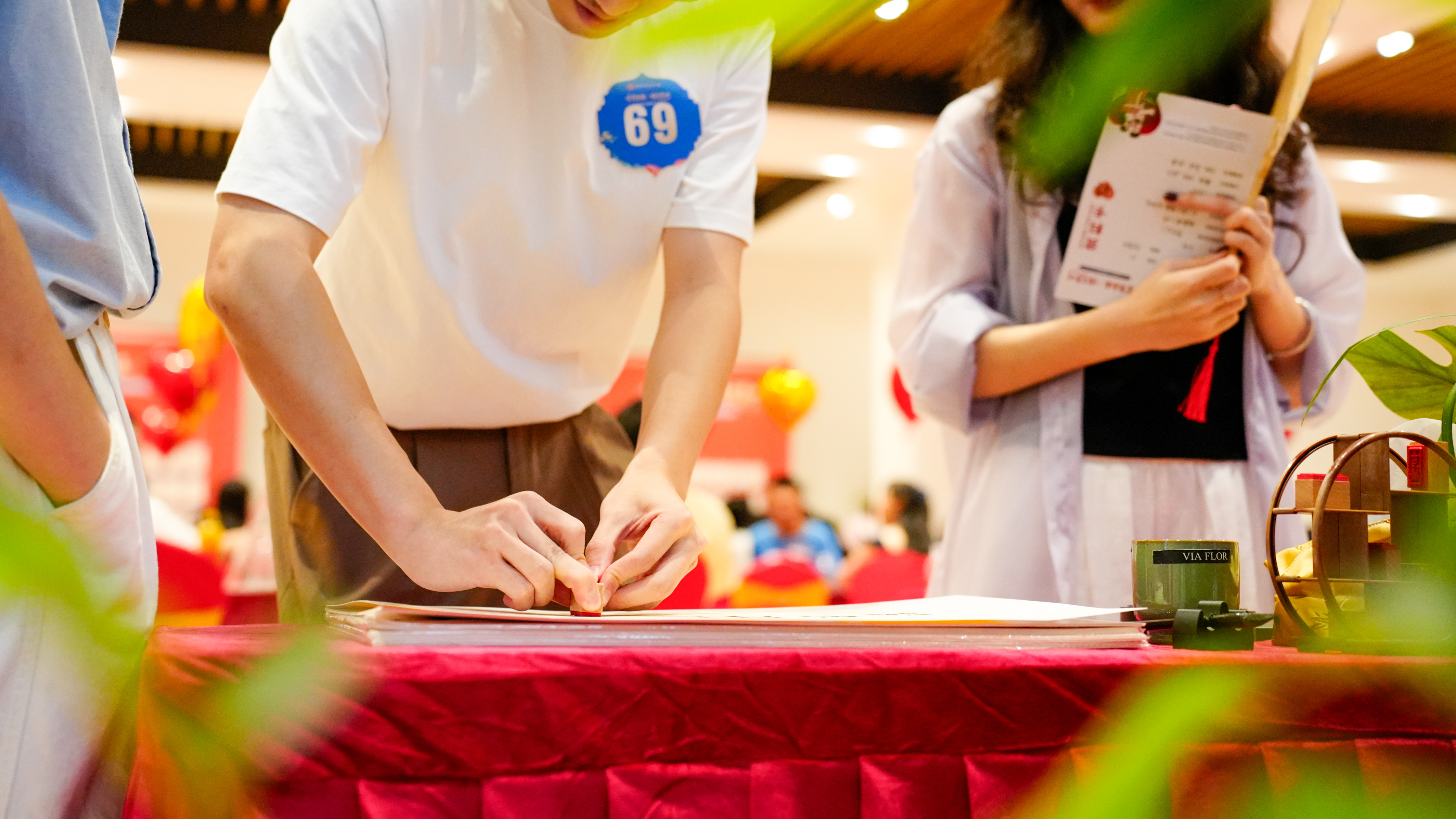 現(xiàn)場精心布置了書法案臺與點茶區(qū),男女嘉賓可自取宣紙、毛筆,書寫中秋詩句、生活寄語,讓墨香承載心意;也可在茶席旁學習碾茶、注湯、擊拂的技法,體驗宋式點茶,既弘揚了中華優(yōu)秀傳統(tǒng)文化,又營造了傳統(tǒng)節(jié)日氛圍。