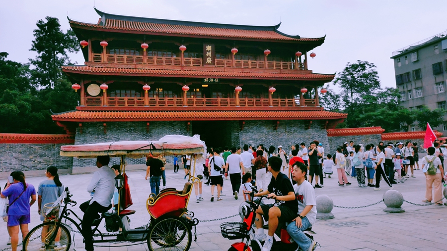 牌坊下的騎樓里,是熱鬧的商家,這里有現(xiàn)代的奶茶、餐飲、小百貨,也有傳承多年的老字號、傳統(tǒng)特產(chǎn)。繁榮的店面間,偶爾可見古城居民或在自家門前悠閑納涼,或三五好友在巷口支起小桌飲茶聊天。一路走走逛逛,逛累了,坐上一輛黃包車,時(shí)而在古城中心的人潮中穿梭,時(shí)而轉(zhuǎn)進(jìn)一條小巷遠(yuǎn)離了喧囂。奶茶鋪、餅家、便利店、潮州府、駙馬府……坐著這么一輛黃包車,看盡了老街上商家的繁華,走遍了老城里的文化傳承,也感受到了古城居民生活的閑適,各種各樣的生活狀態(tài)呈現(xiàn)于城內(nèi),生動(dòng)詮釋了“繁華市井生活”。