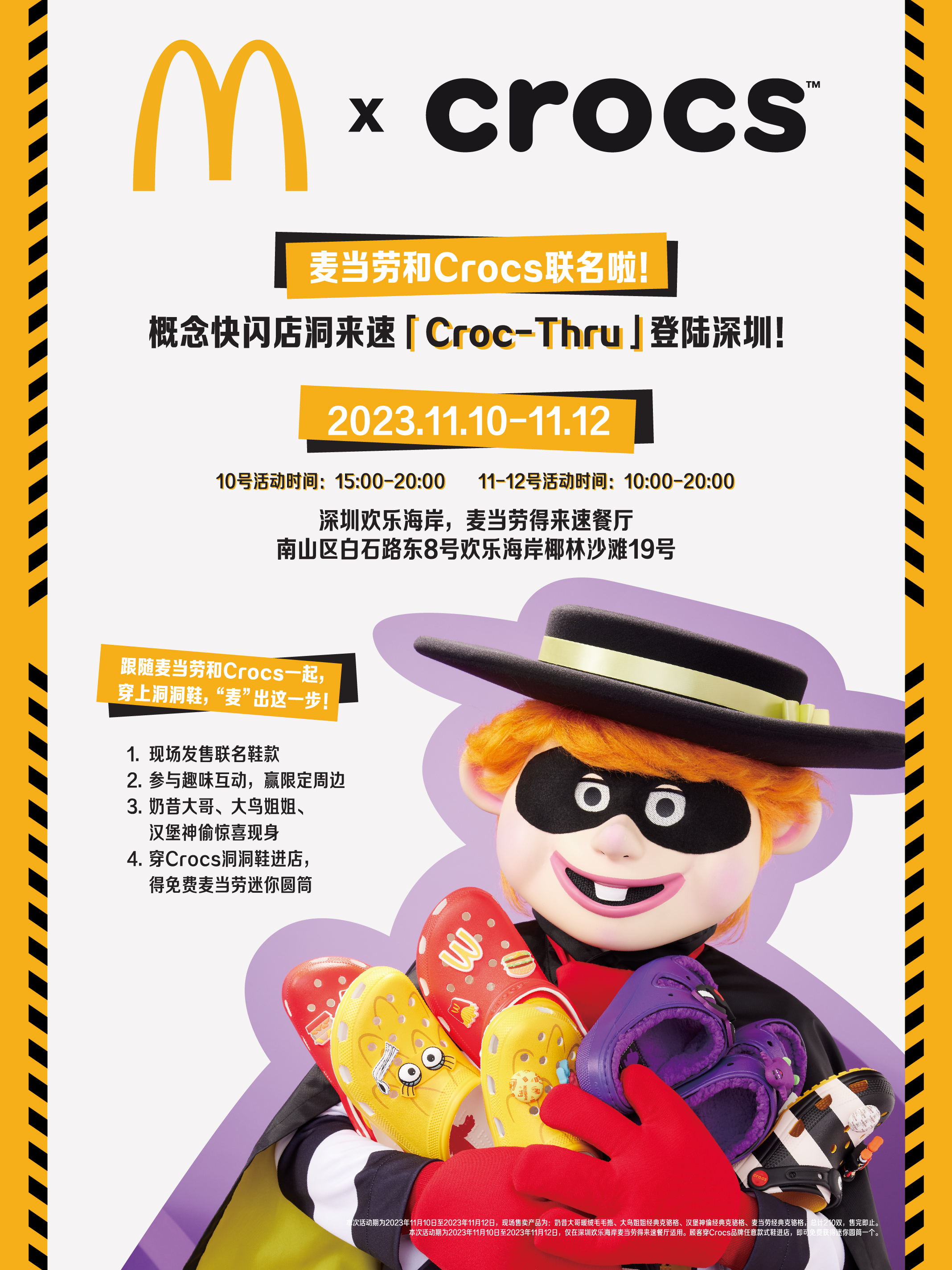 除聯(lián)名系列產(chǎn)品外,麥當勞中國還將聯(lián)手Crocs首發(fā) “洞來速” 潮流快閃活動,開啟限時趣味體驗。Croc-Thru(洞來速)靈感來源于麥當勞Drive-Thru(得來速餐廳),消費者可以步入模擬得來速購餐窗口的線下快閃店,購買麥當勞x Crocs聯(lián)名產(chǎn)品。這一全新概念的快閃店將于11月10日15點至11月12日20點,登陸深圳歡樂海岸麥當勞得來速餐廳。深圳 “洞來速” 快閃店將在現(xiàn)場發(fā)售部分聯(lián)名鞋款,此外,消費者還有機會與奶昔大哥、大鳥姐姐及漢堡神偷互動,并贏取限定禮品。