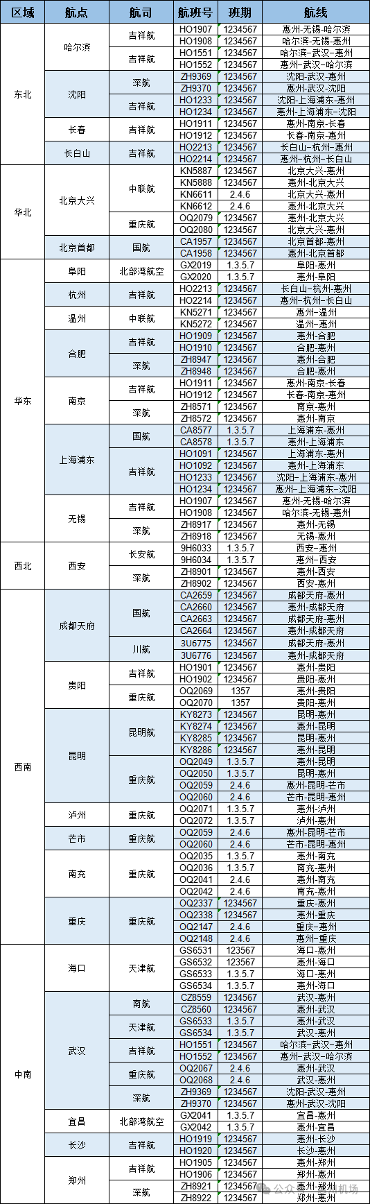 以上航線增加及恢復后,在春運期間惠州通往北京的航班每天達到3班(其中周二、四、六達到每天4班),武漢航線每天達到4班,成都航線每天達到3班,哈爾濱航線每天達到2班。