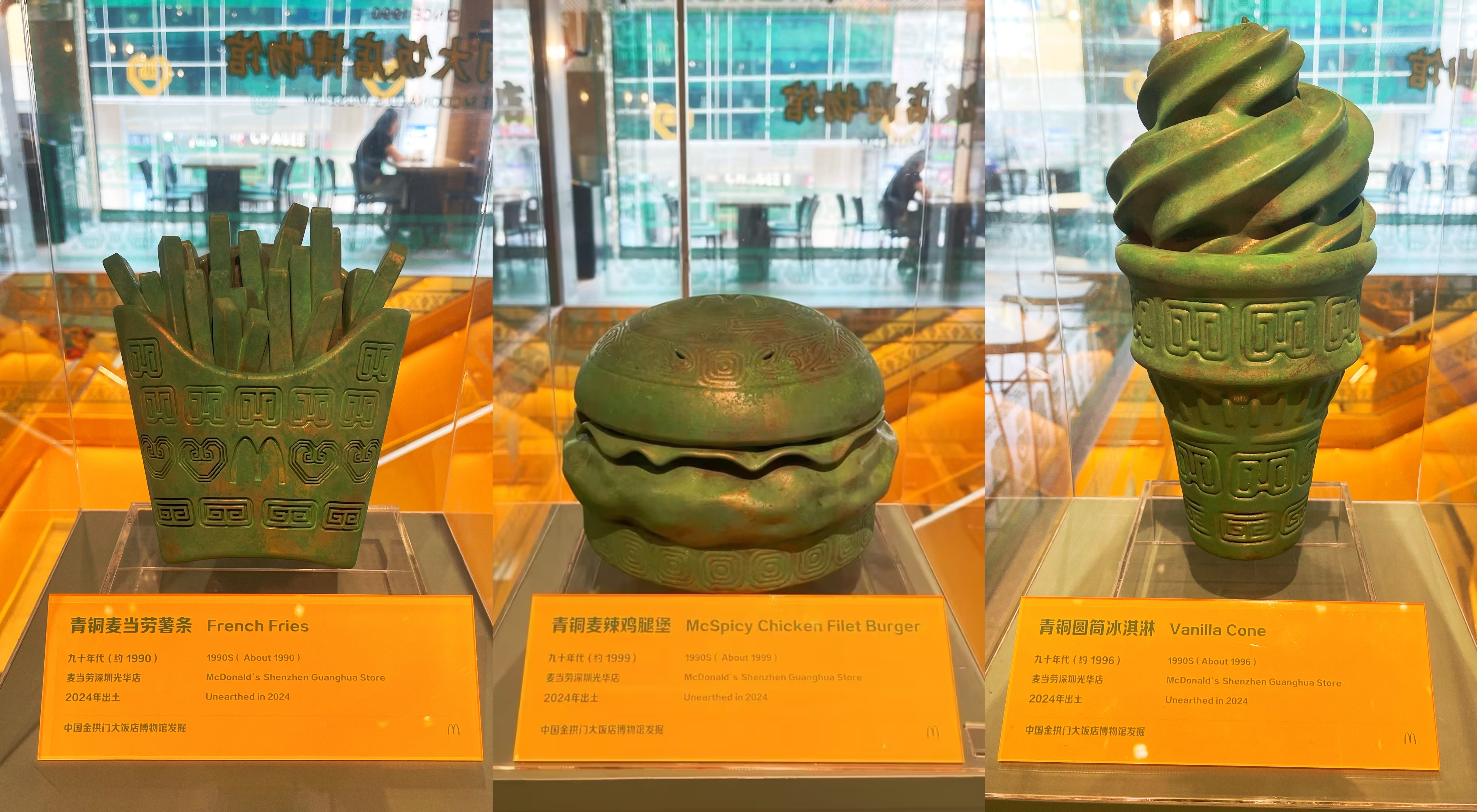 現(xiàn)場可看到薯?xiàng)l、漢堡、圓筒冰淇淋的“青銅器”展示