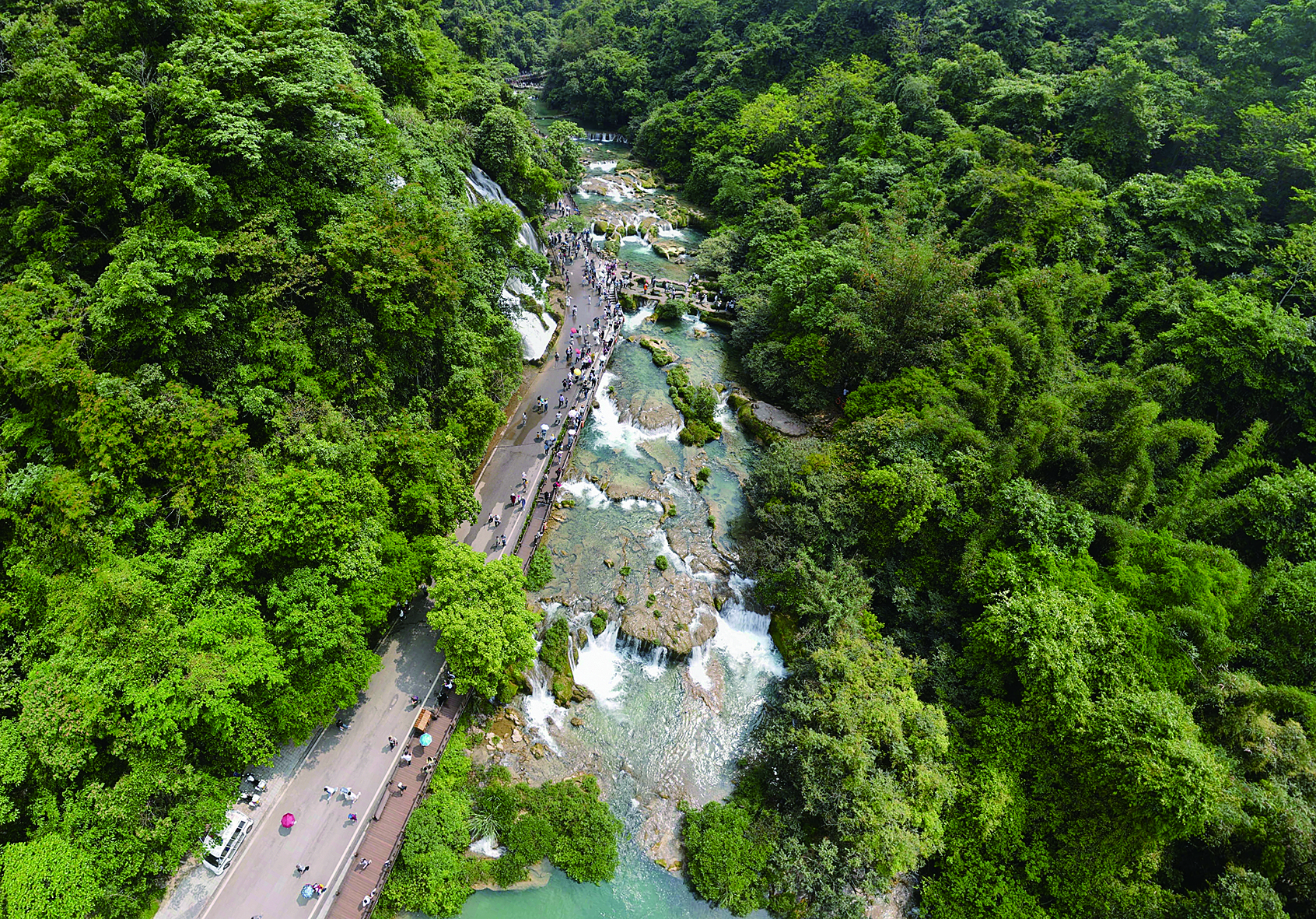 響水河層層疊疊順流而下,在3公里長的河段上形成68級(jí)瀑布,落差達(dá)400多米,一路下來,景色猶如畫廊。小七孔古橋臥在碧綠的河水上,連接起貴州和廣西,散發(fā)古橋韻味。