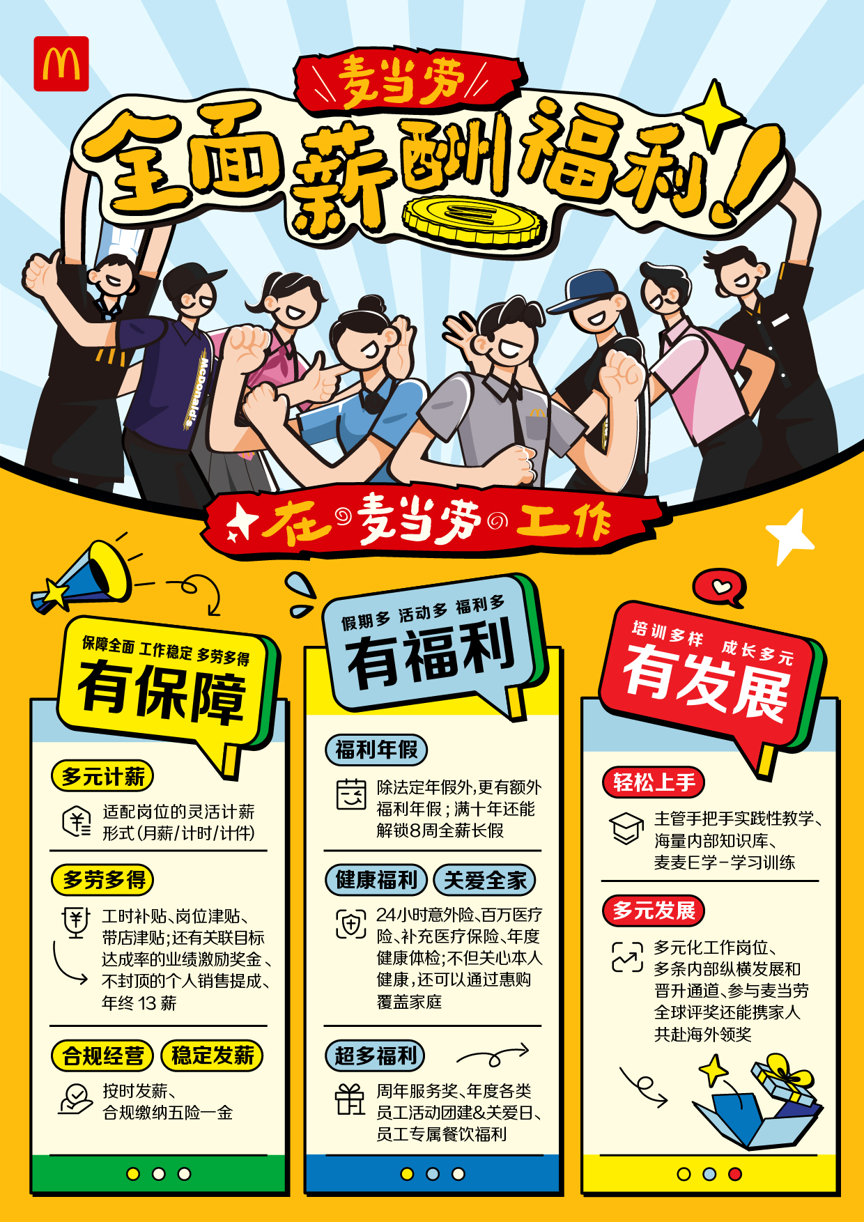 ”人員是麥當(dāng)勞最寶貴的財(cái)富,我們希望每位員工在這里有保障、有福利、有發(fā)展,能在工作中有安全感,在成長(zhǎng)中找到幸福感和獲得感,“麥當(dāng)勞中國(guó)首席人員官王艷偉表示,”麥當(dāng)勞全面薪酬福利體系為員工提供全方位支持,不僅對(duì)員工的辛勤付出及時(shí)認(rèn)可和感謝,更為他們的未來成長(zhǎng)持續(xù)規(guī)劃和投資,以培養(yǎng)人才全面發(fā)展,促進(jìn)高質(zhì)量充分就業(yè)!
