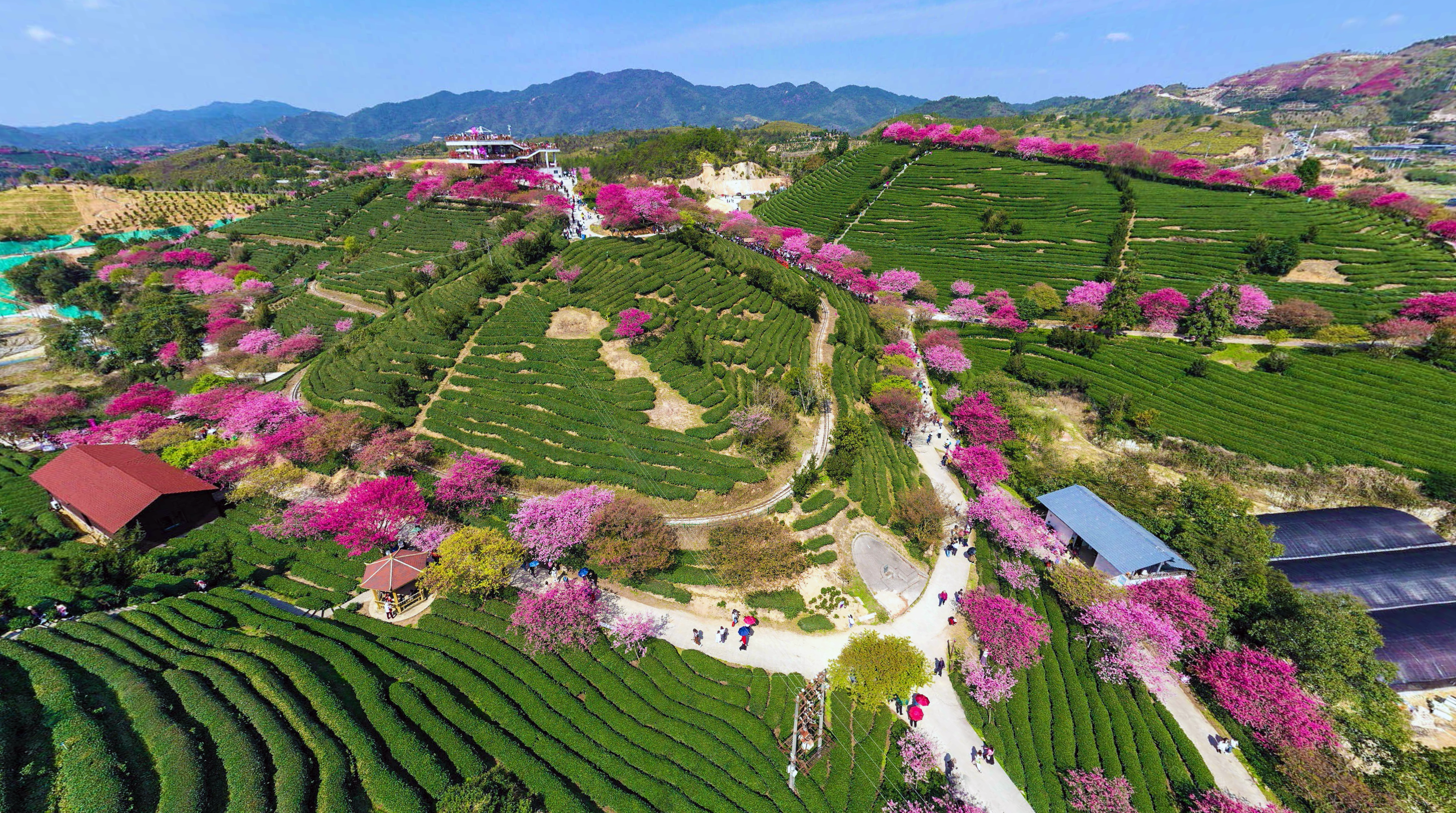 永福櫻花園,茶田綠浪與櫻花粉霞交織。