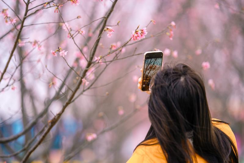 游客賞櫻打卡。
