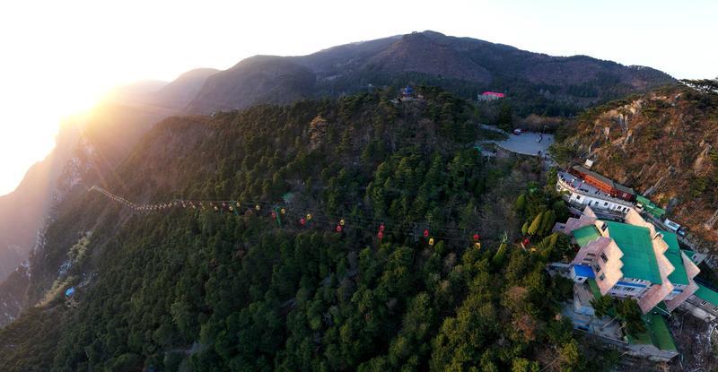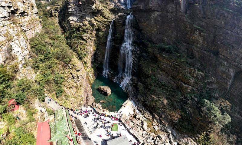 “飛珠散輕霞,流沫沸穹石”,三疊泉在五月將迎來(lái)豐水季。155米的三級(jí)瀑布如白練垂空,沿陡峭石階下行時(shí),飛濺的水霧會(huì)為每位到訪者送上天然的清涼SPA。