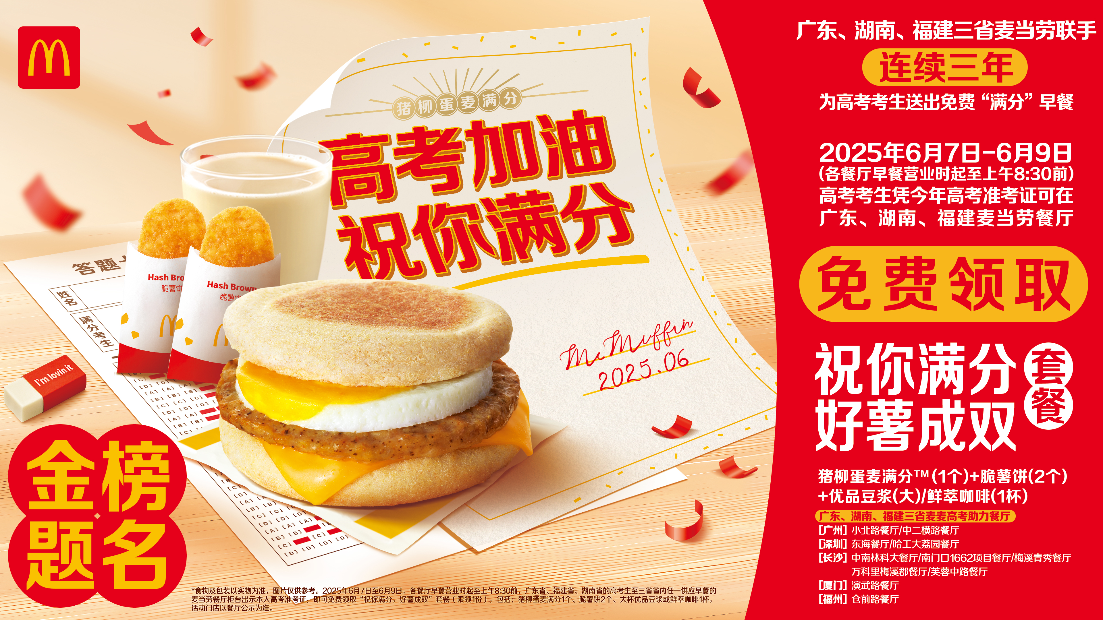 今年,廣東、福建、湖南三省將在近2200家麥當勞餐廳再度推出免費“麥滿分”早餐公益行動,助力三省考生以滿分狀態(tài)迎接考試。