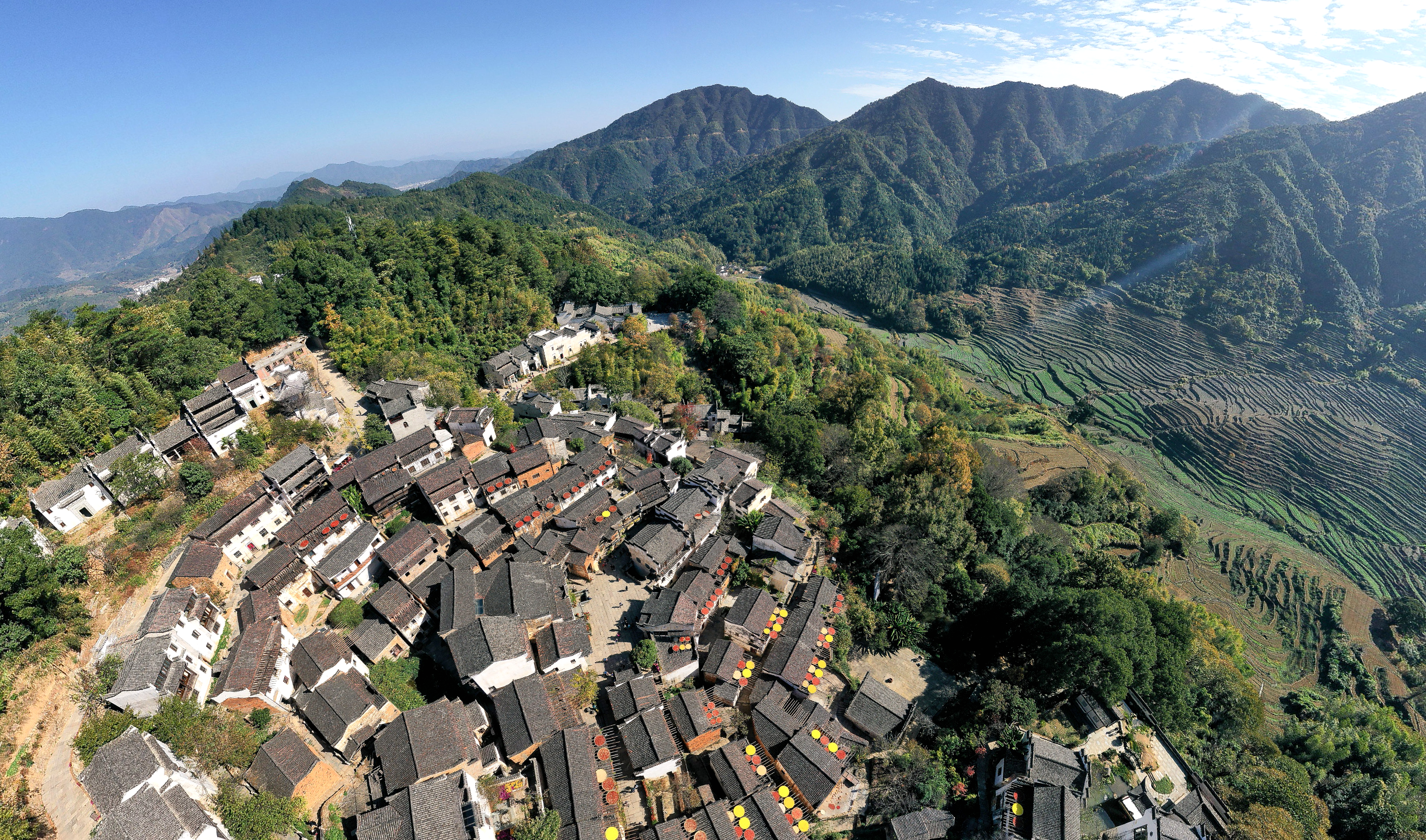 掛在崖壁上的徽派古村,四季被油紙傘、辣椒簾和鮮花包圍。秋曬時(shí)節(jié)的“曬秋”景觀,讓這里成為攝影師追逐光影的天然影棚。
