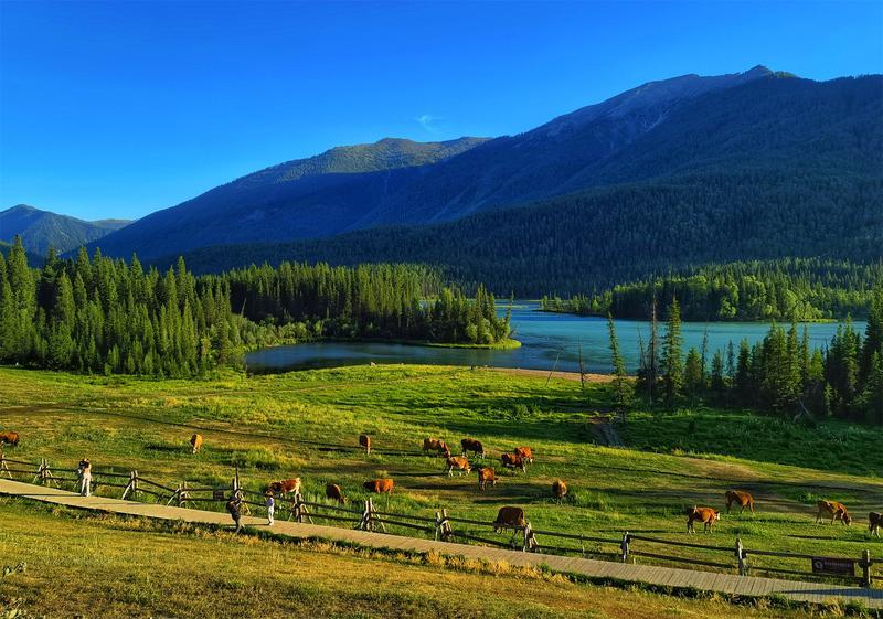 天山懷抱中的高山冷水湖。湖水清澈見底,透明度極高,在陽(yáng)光照耀下呈現(xiàn)出令人心醉的藍(lán)。湖畔是遼闊的高山草甸,夏季野花如繁星點(diǎn)綴,秋季牧草金黃。遠(yuǎn)處雪山連綿,倒映在如鏡的湖面上,牛羊悠然漫步,構(gòu)成一幅寧?kù)o致遠(yuǎn)的絕美畫卷,“凈海”之名,名副其實(shí)。