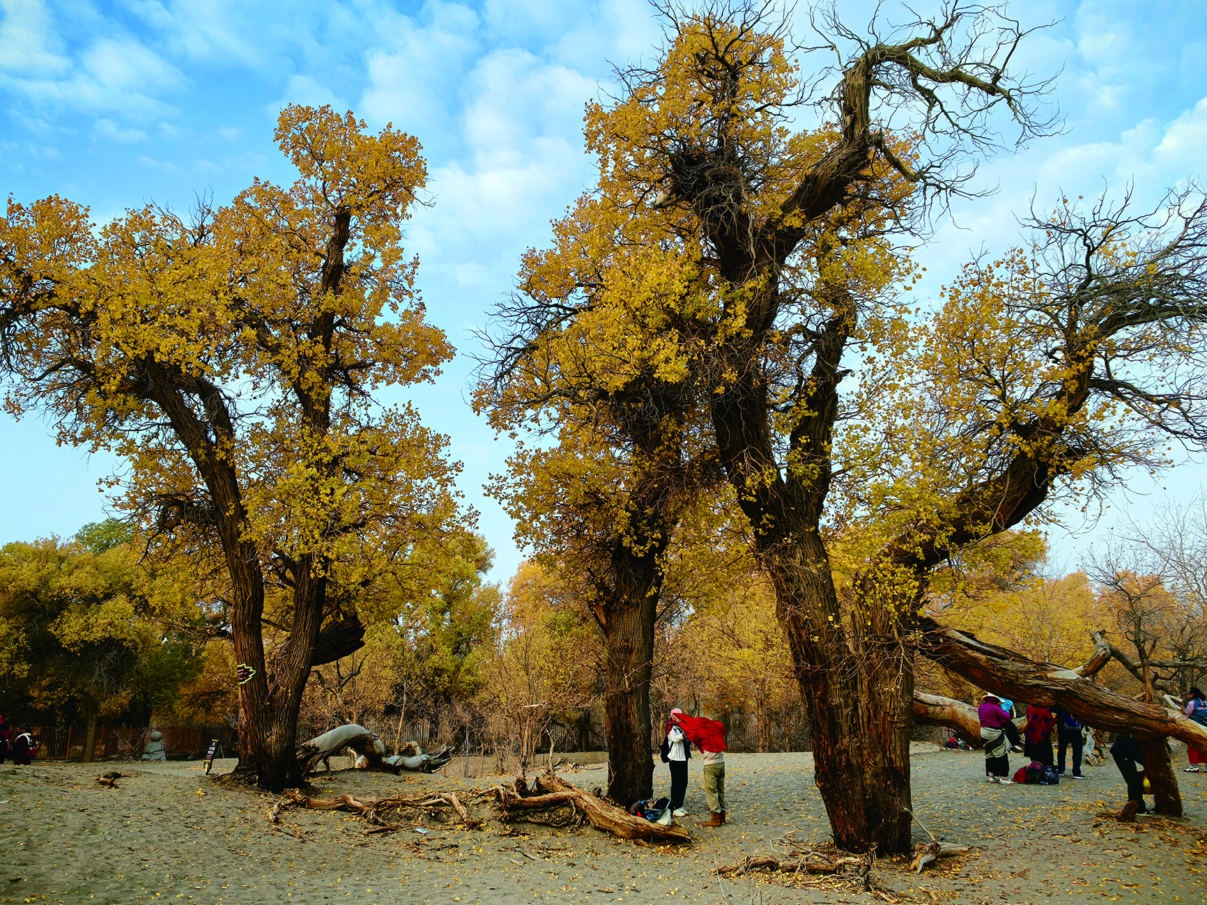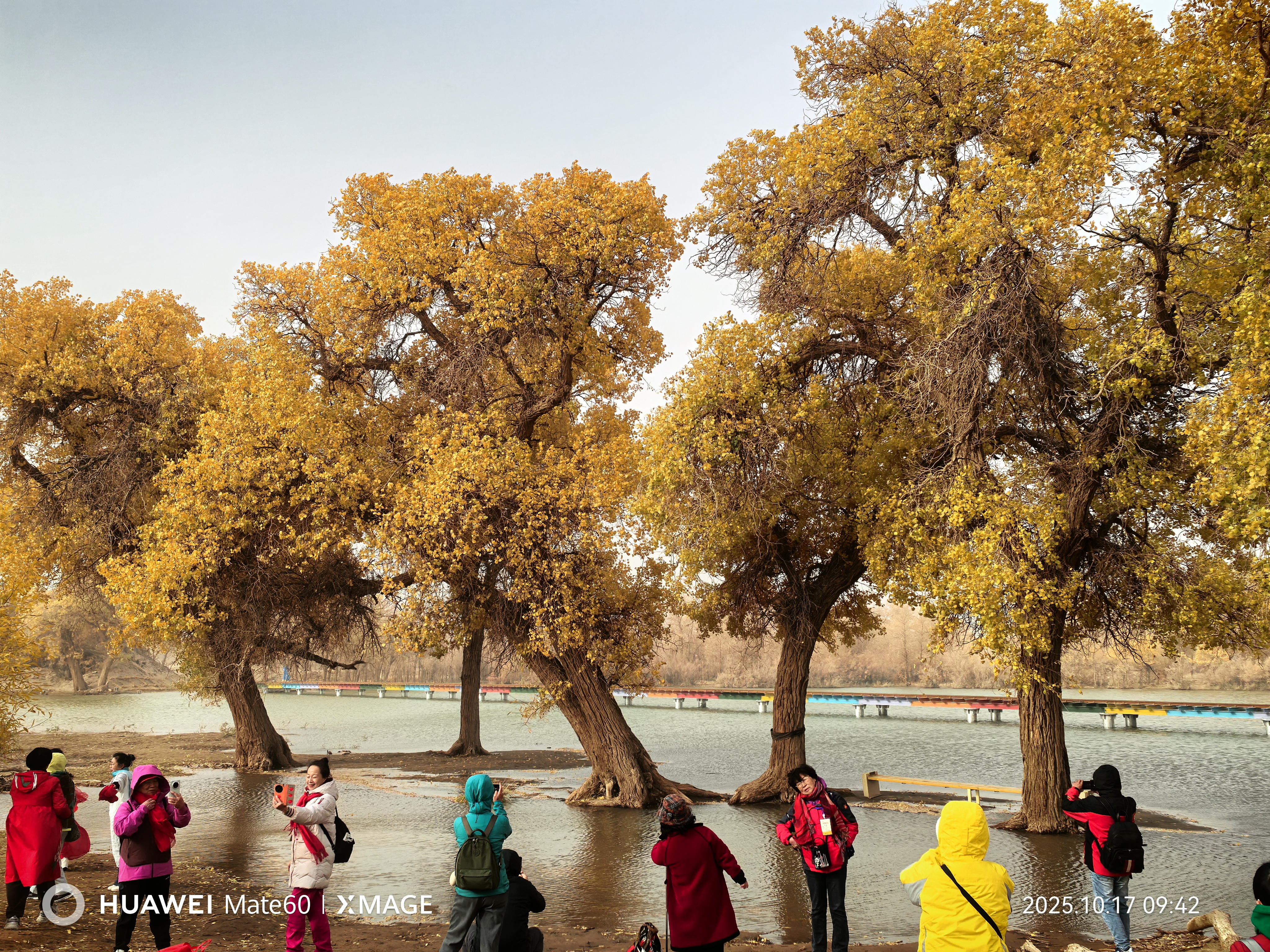 按照行程安排,他們先探訪了額濟(jì)納旗八道橋胡楊林景區(qū)!皬囊坏罉虻剿牡罉颍康罉蚓吧疾灰粯!惫鸷突貞,二道橋的水中胡楊林最是秀美,金色的胡楊倒映在黑河中,波光與樹影交織;四道橋被稱為“英雄林”,千年胡楊樹干粗壯、形態(tài)蒼勁。
