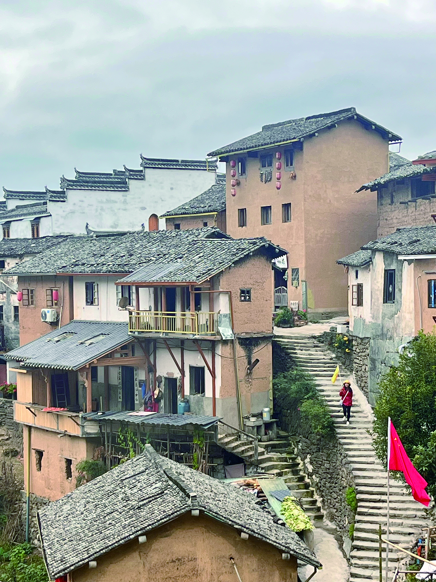 第三天,我們?nèi)チ恕巴钅献詈笠黄瑑敉痢标柈a(chǎn)土樓。土黃色房子依山而建層層堆砌錯(cuò)落有致,處處掛滿金黃色玉米和紅辣椒,一派古老恬靜的風(fēng)格,與世隔絕不爭(zhēng)光陰。下山途中天空突然飄灑起雨滴,土樓漸漸變得縹緲朦朧。回眸一望,有些“南朝四百八十寺,多少樓臺(tái)煙雨中”的意境,這是我喜歡的江南煙雨。