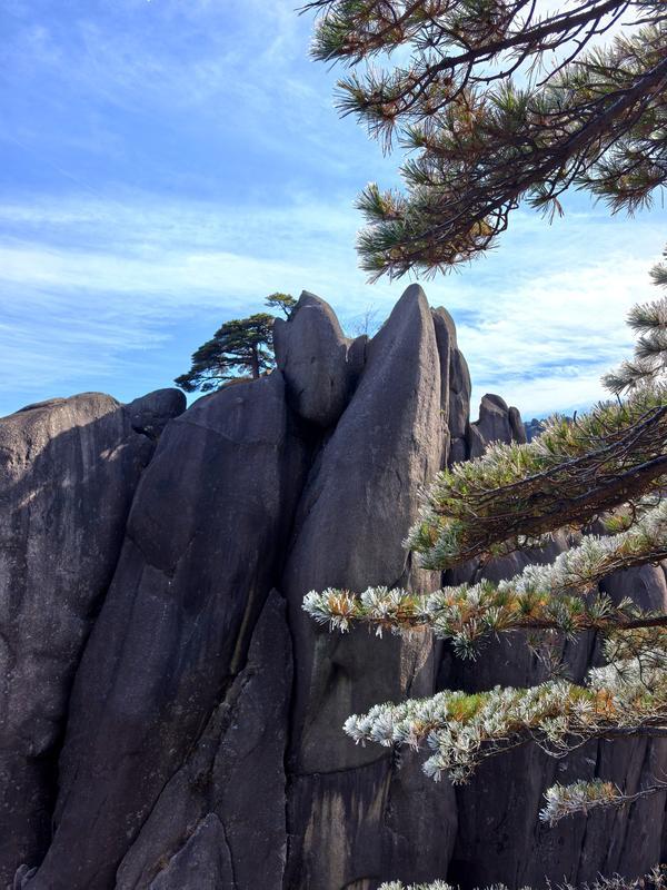 第四天重頭戲:登黃山。大美黃山依然歲月繾綣葳蕤生香,英姿挺拔傲視群雄。昨晚溫度驟降產(chǎn)生的霧凇今朝陽光照耀下熠熠生輝,隊(duì)友們個(gè)個(gè)摩拳擦掌全力以赴。纜車緩緩上升,所見之處皆是突兀的青黑巨石上一大片一大片的不老松,尉為壯觀。包括6位70歲長者在內(nèi)27人全體通過崎嶇陡峭的“好漢坡”,在聞名遐邇的迎客松前留下自己的形象。登上光明頂?shù)?7位勇士有7位60歲以上,他們?cè)诓紳M冰晶與霧凇的蜿蜒狹窄道路上奮勇前行。隊(duì)友們團(tuán)結(jié)互助相互攙扶互相配合,征服奇山險(xiǎn)峰挑戰(zhàn)自我,夢(mèng)想成真不留遺憾……聽,凱旋歸來的笑聲多么爽朗,江山如畫我們亦是豪杰。