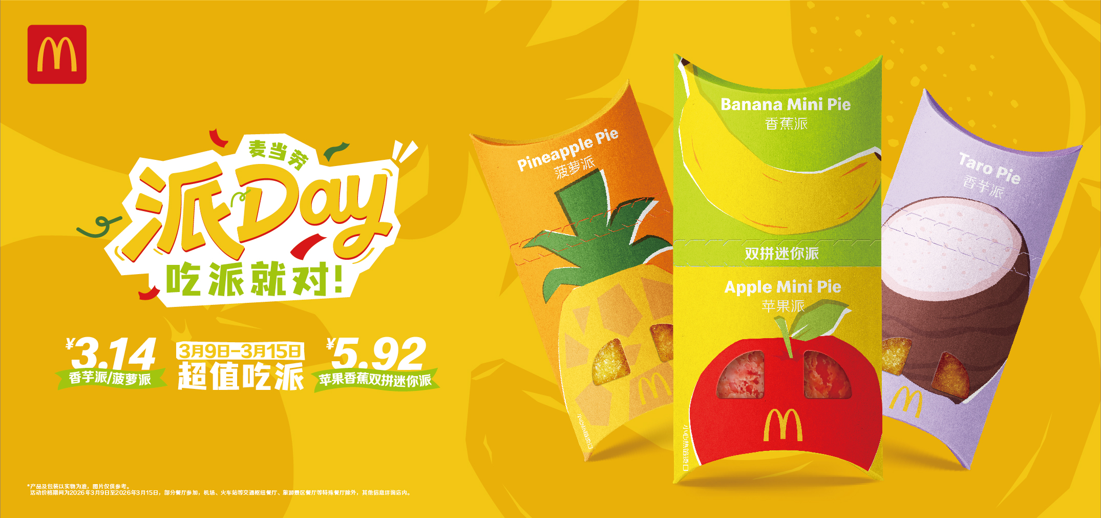 2026年3月9日至3月15日,顧客可通過到店取餐及麥樂送購買指定派產(chǎn)品。經(jīng)典產(chǎn)品香芋派與菠蘿派以3.14元的“派Day記憶價”超值回歸,全新“蘋果香蕉雙拼迷你派”則以5.92元的超值價格加入節(jié)日促銷陣容——3.14與5.92,巧妙呼應(yīng)了國際圓周率日的3.141592……數(shù)字巧思。全新的蘋果迷你派采用法式千層酥皮,內(nèi)餡融入清新蘋果粒與淡淡肉桂香氣;香蕉迷你派呈現(xiàn)香蕉濃郁醇厚的香甜風(fēng)味。通過雙拼迷你派的創(chuàng)新形式,一次品嘗兩款回歸的人氣口味,開啟一場誠意滿滿的吃派狂歡。